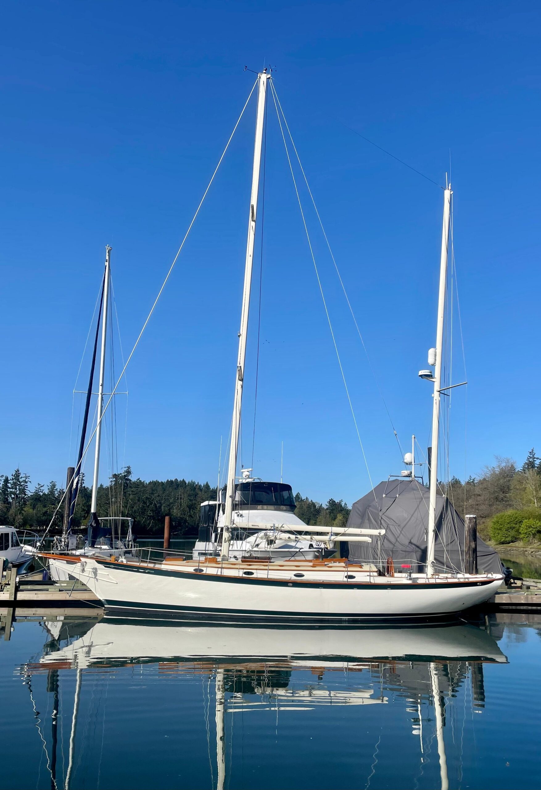 25 years ago Ferenc Màtè, author of the International Best-Seller, “The World’s Best Sailboats Vol 1 & 2” was in search of a new boat. His final choices were a Hinckley or a Swan, but at a chance encounter in a remote BC Cove, Màtè fell in love with the stunningly elegant, beautiful and fast 41 foot custom ketch that world-acclaimed naval architect Bruce King designed for himself. That boat, “Warm Rain II” is now available. For those wanting the very finest of craftsmanship. Be ready to turn heads and accept endless compliments with the most beautiful boat in any harbour. She is now back in the water after spending a cosy Winter in a heated shop where her Shipwright/Caretaker meticulously refinished the exterior brightwork and teak decks. The finished result is spectacular. Her cold molded hull of Port Orford Cedar was completed by Master Shipwright, Jim McClelland and is paired with the finest of finishing materials. Further interior refinements have been completed by the skilled crew at Jespersen Boat Builders. A 2020 survey reports: “This is an exceptional execution of a beautiful classic design from the board of a well known designer. The interior is well planned and cabinetry is of superb quality……the vessel does not show its age.” A modern underbody (fin keel, spade rudder with skeg) provides for great performance with directional stability. Fitted with new Main and Genoa, “Warm Rain II” is ready for inspection by appointment only, please.