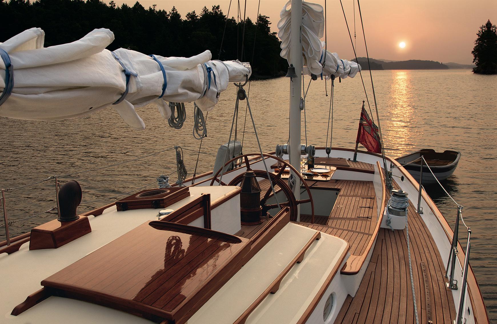 A traditional yacht for the purist with a modern under-body that gives surprising performance under sail. Elegant wineglass transom and clipper bow add to the pure delight of Warm Rain’s form and function.