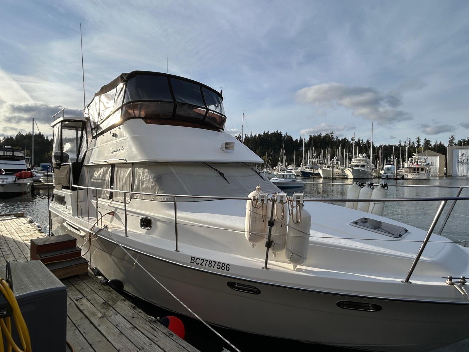 This beautiful aft cabin Queenship is a boathouse/Cover kept quality yacht that shows pride of ownership. With 2 staterooms and 2 heads, a spacious mid-level galley, covered sundeck and large flybridge she is a boat with room for a family or guests.