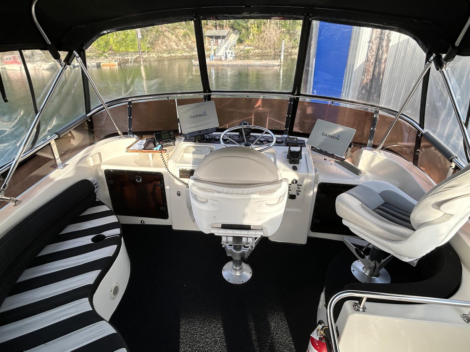 Up a few steps you are in the large flybridge with twin helm chairs and ample bench seating. The visibility is excellent all around and the full canvas keeps you out of the weather.