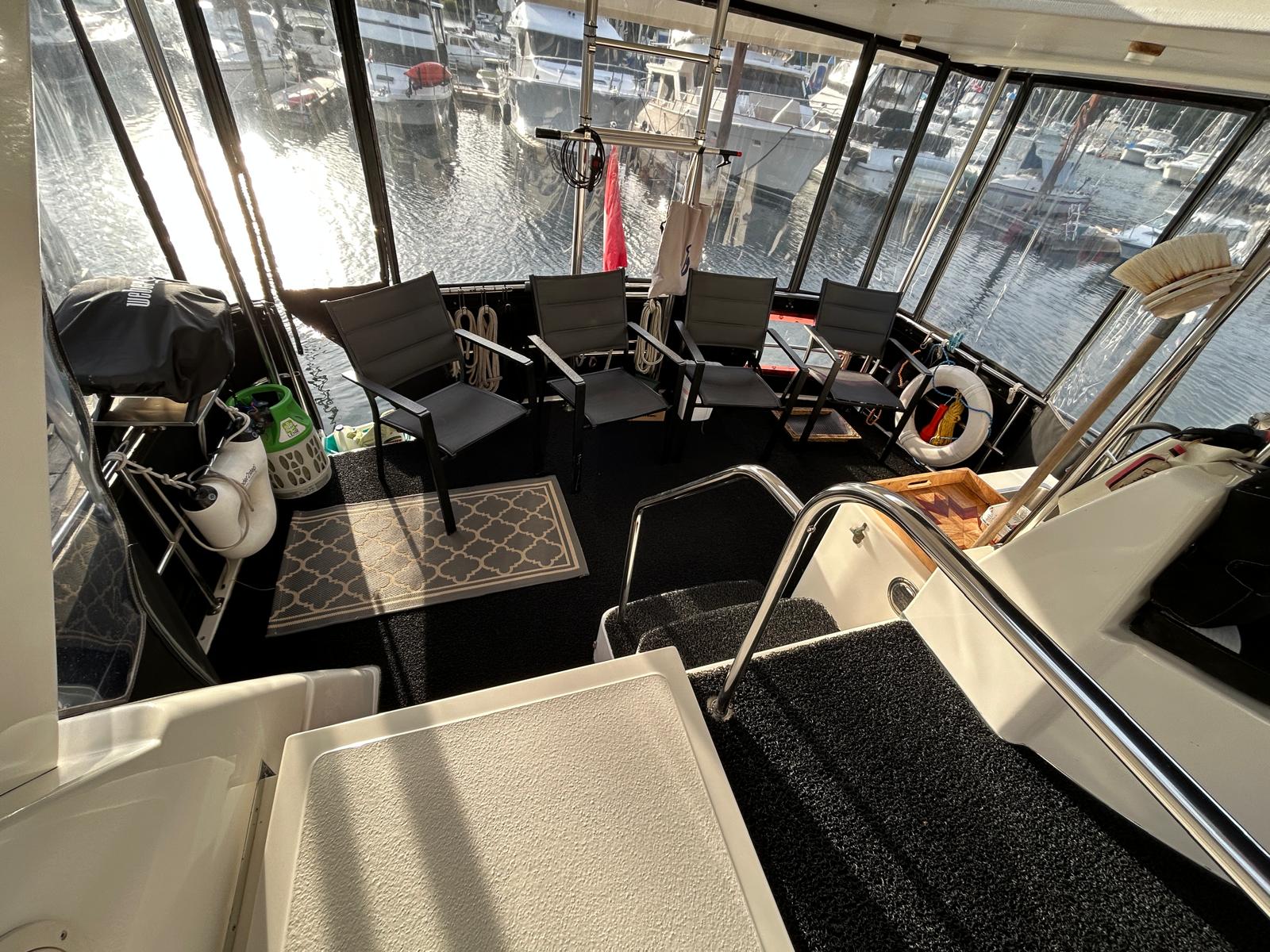 Stepping aboard from the side deck you go aft to the fully enclosed sundeck under a hardtop cover.  There is a wetbar with icemaker and this space has room for a table and chairs creating an outdoor dining and entertaining area.  Here ultra-weave marine flooring adds a nice touch.