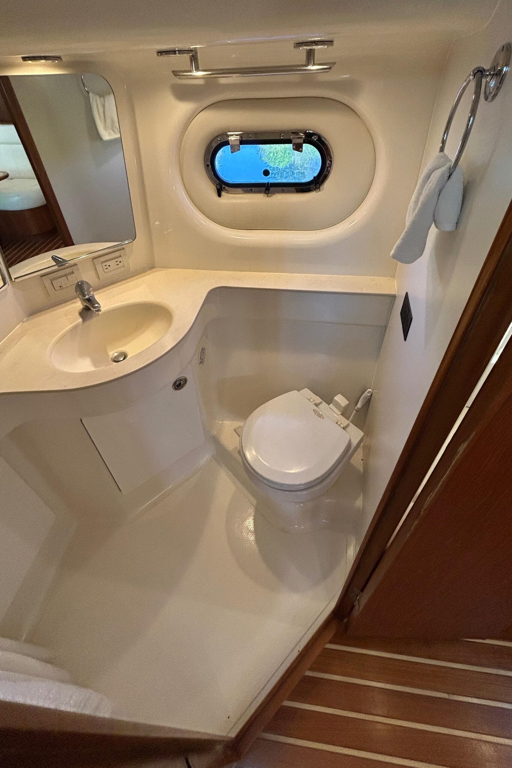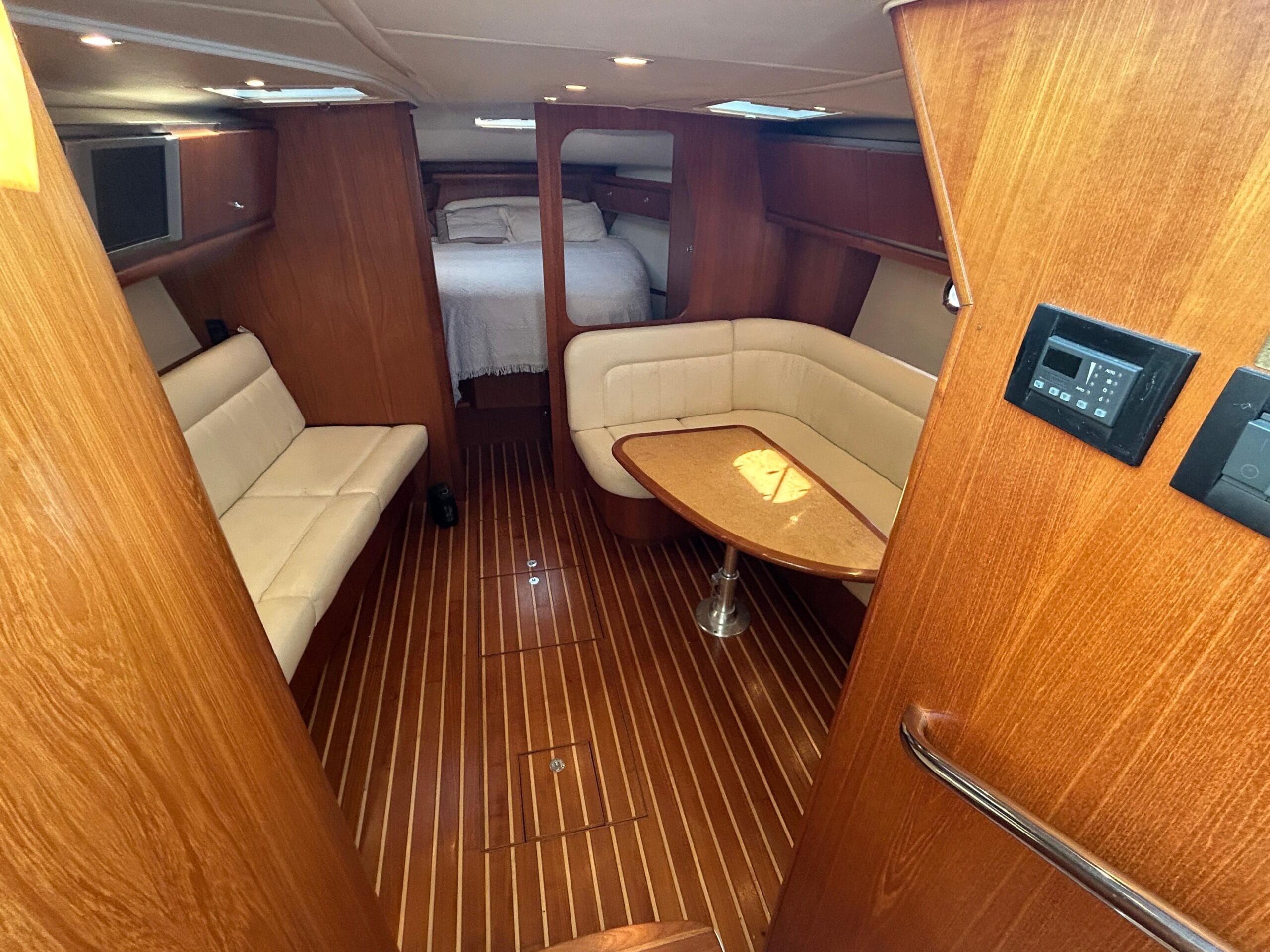On deck, you’ll find a spacious L-shaped companion lounge that comfortably seats guests, and a custom adjustable helm seat for the captain, perfect for long, relaxed cruises. The layout is ideal for entertaining while underway or at anchor.