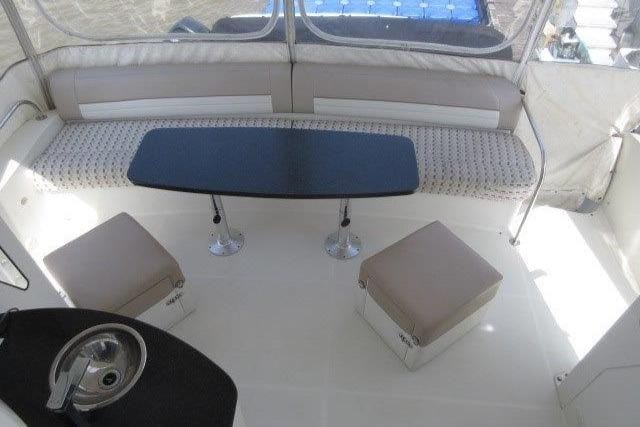 There are wing doors to the sun-deck which is fully enclosed, molded aft-deck stairs, and transom door. The bridge features the optional hard-top with full enclosure and centre glass window with windshield wiper, as well as forced air heat.
