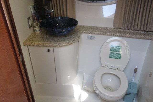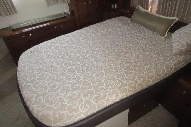 She is sleekly styled with elongated salon windows that blend gracefully into the shape of the hull. Her interior has 7′ headroom, a full-beam master stateroom with a walkaround queen berth, a forward stateroom with double berth, and a well appointed main salon.