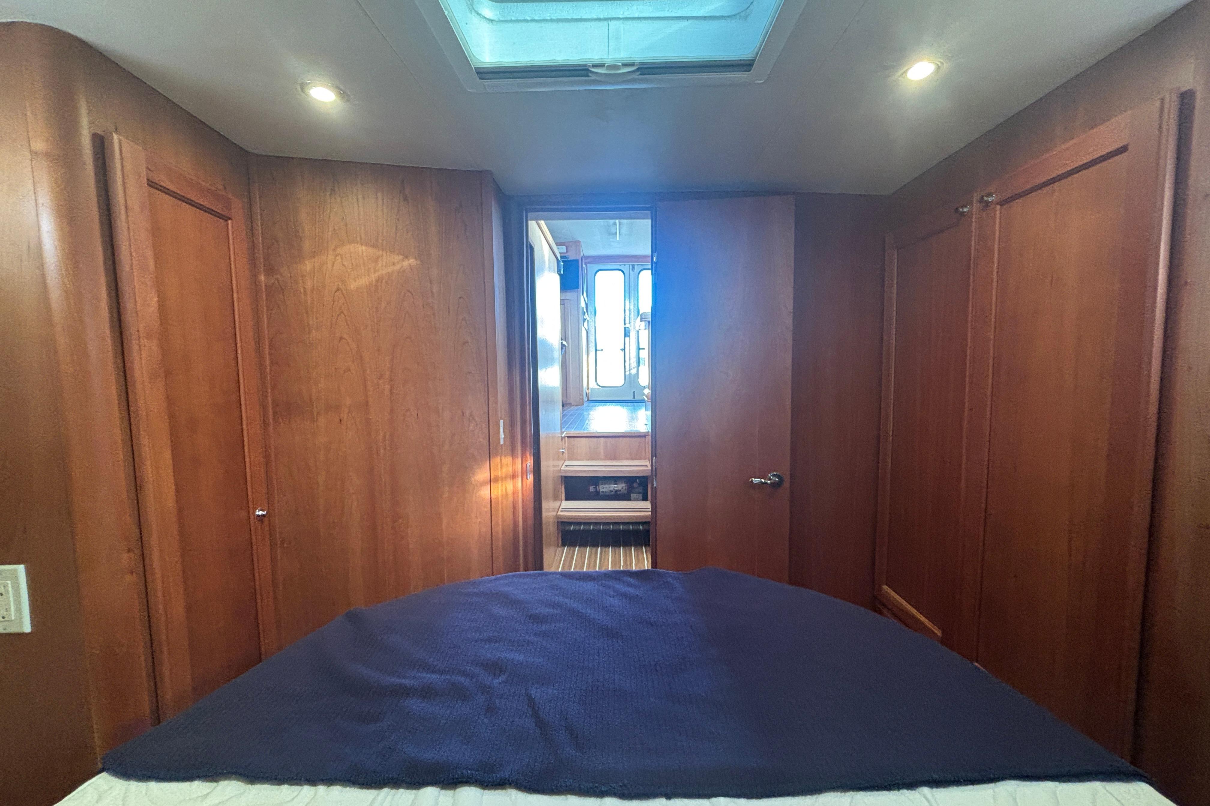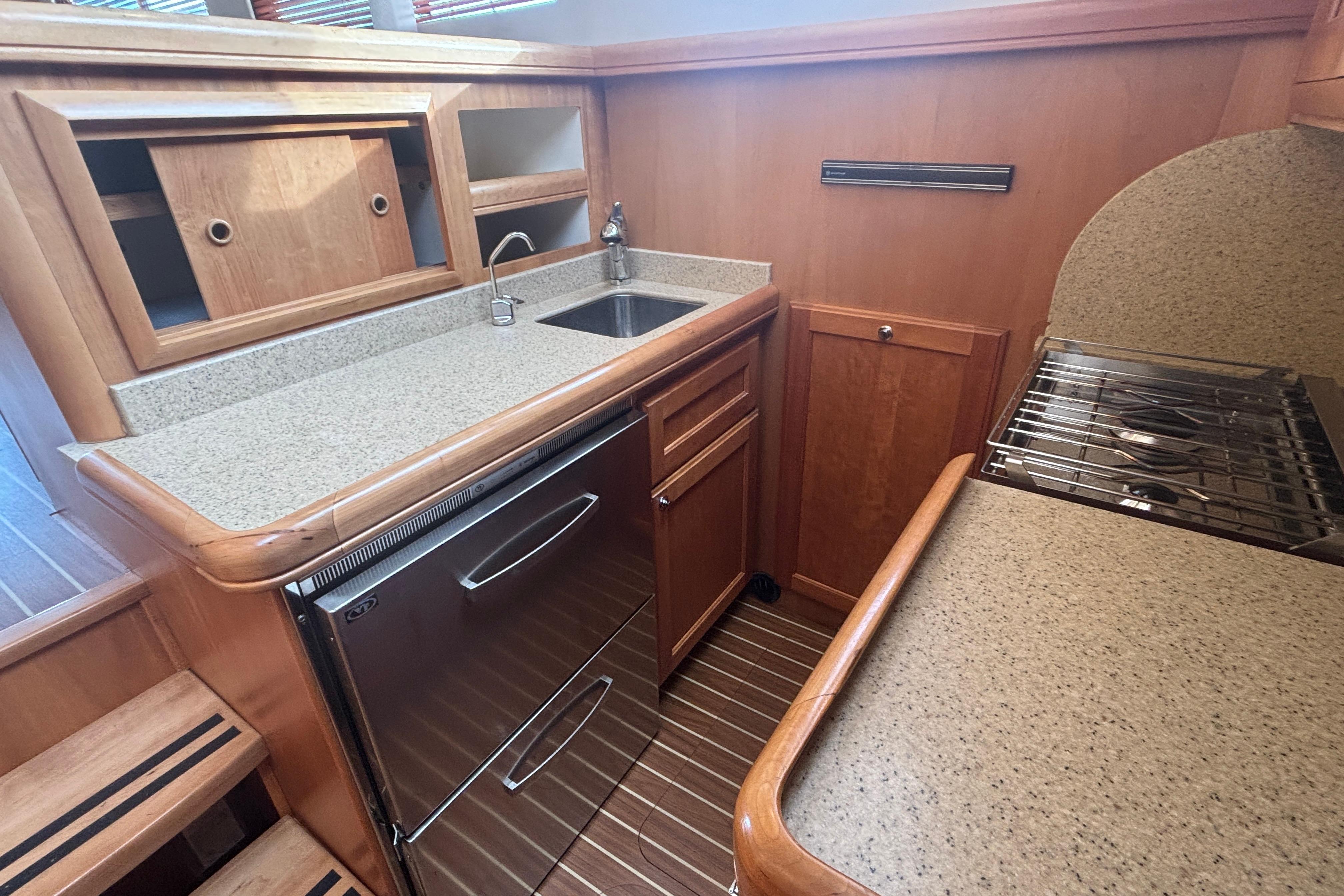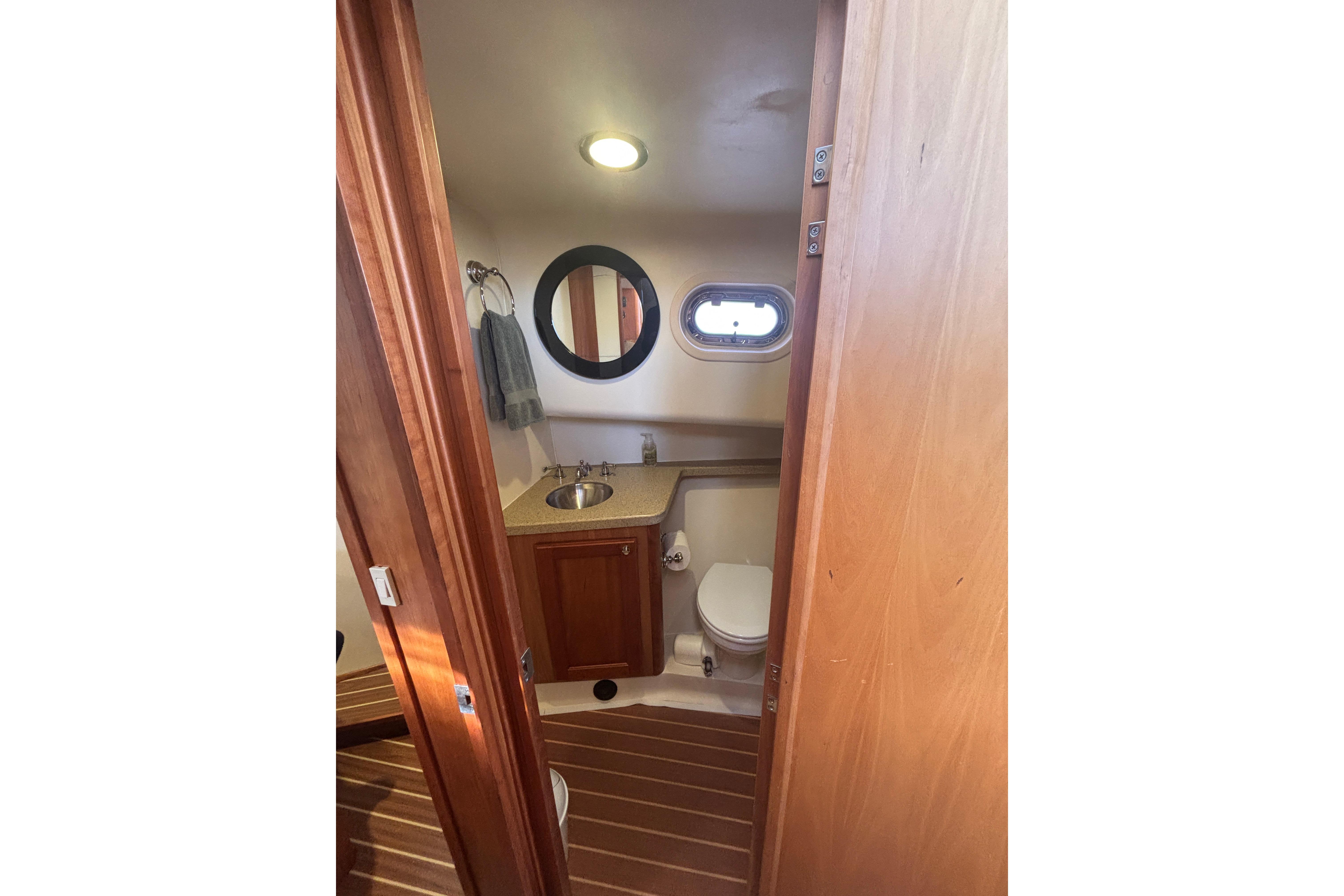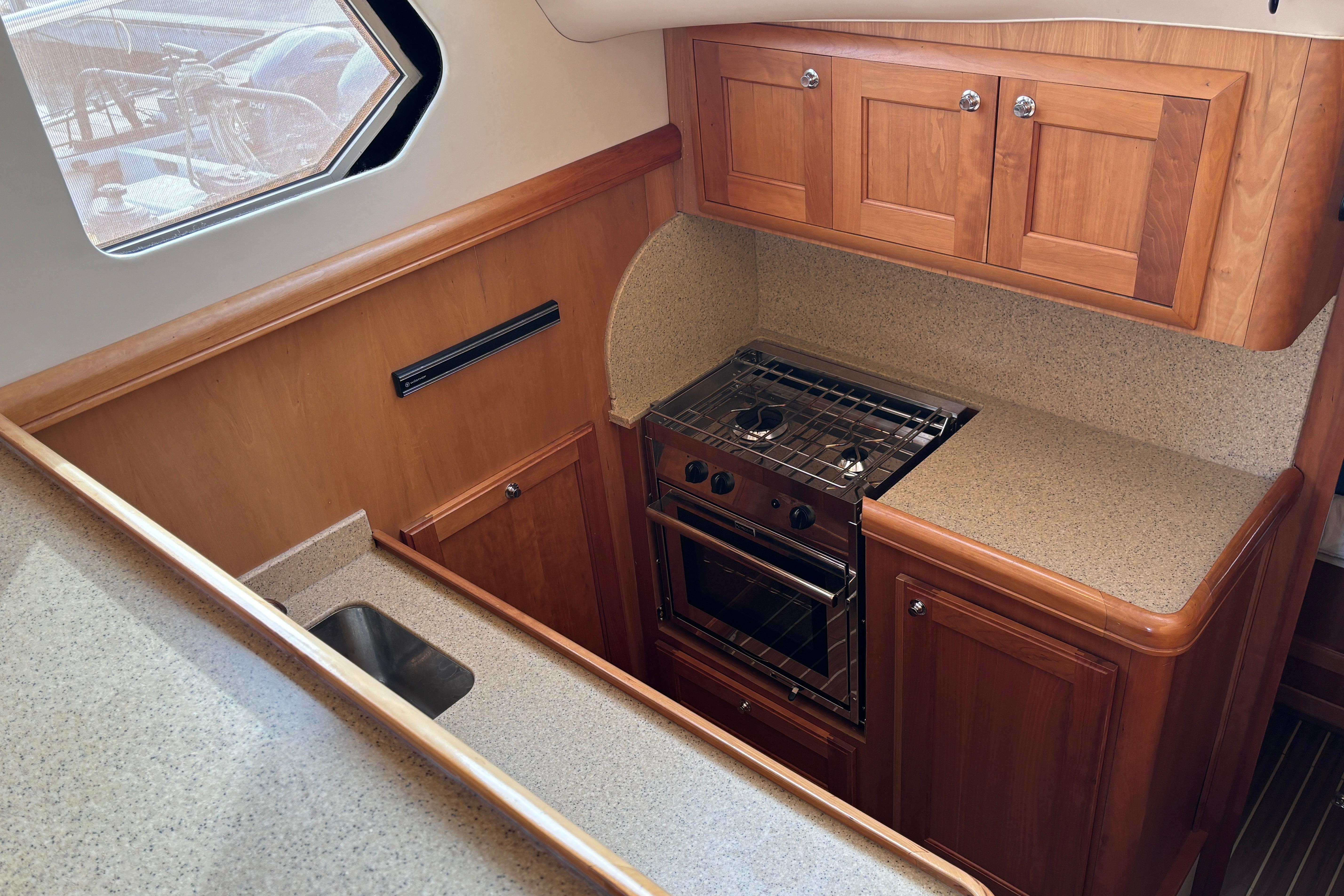Designed for comfortable coastal cruising, the Mainship 34 Trawler combines a salty profile with sturdy construction and a practical single-stateroom interior. Many will see the 34 as the ideal boat for the cruising couple -- easily handled in tight quarters, easy to maintain, and reasonably easy on the wallet. Built on a semi-displacement hull with a full keel, the galley-down layout results in a notably spacious salon with attractive cherry joinery and large windows. A serving counter (with two stools) overlooks the galley, and a convertible sleeper-sofa accommodates overnight guests. The U-shaped galley has all the amenities required for preparing meals including generous storage and Corian counters. Forward, the stateroom has a centerline double berth and the double-entry head compartment includes a separate shower stall. On deck, a flybridge overhang shelters the Mainship's wide walkways making getting around easy. A side door beside the lower helm opens to the deck for easy access while docking.