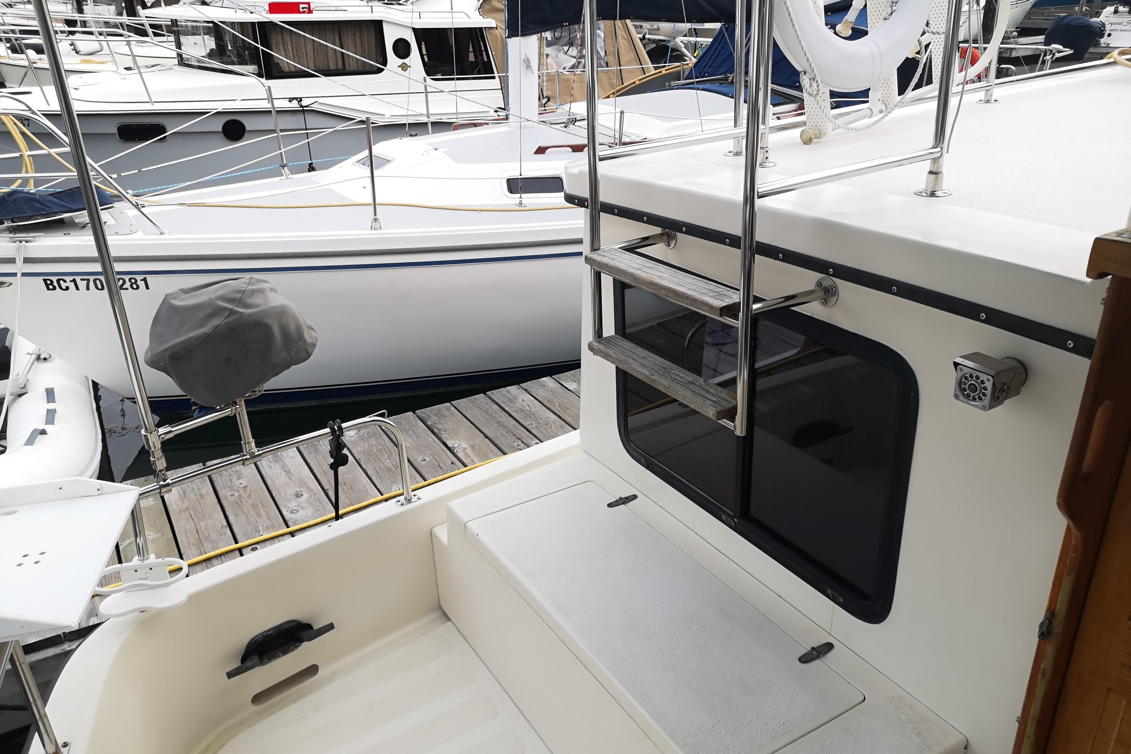Boarding the vessel the aft cockpit is covered, offering a protected outdoor space that leads up via a cleanly designed ladder to a full S/S railing-enclosed upper deck, an ideal spot for lounging, entertaining, or additional storage. A well-put-together tender package is also included, cleanly secured to the aft with a SeaWise davit system that allows for easy launching and retrieval.