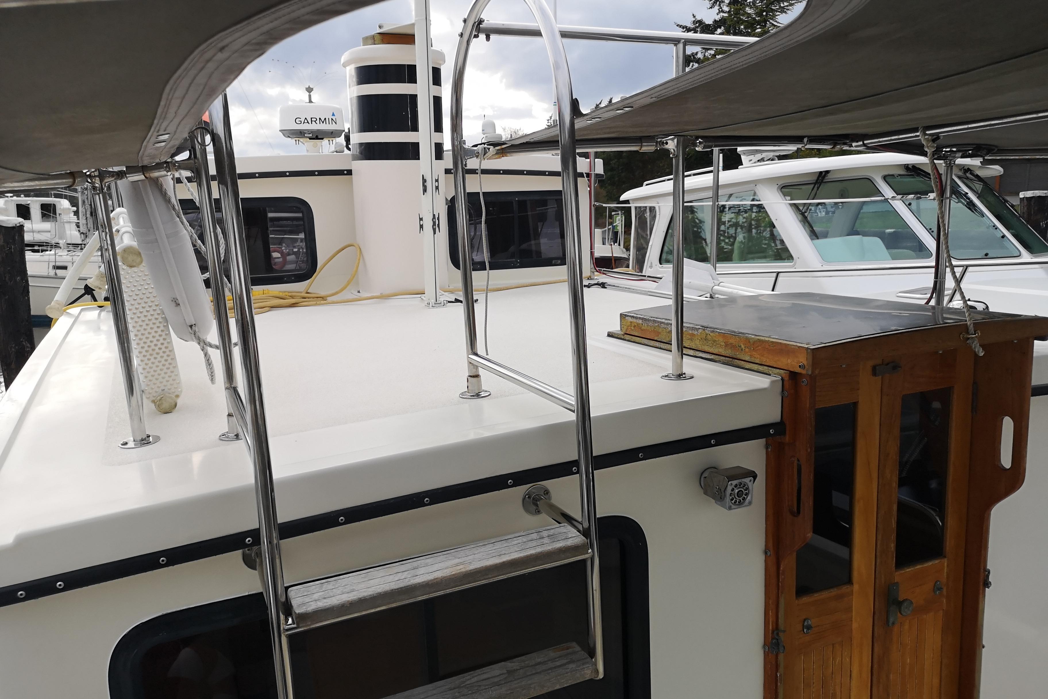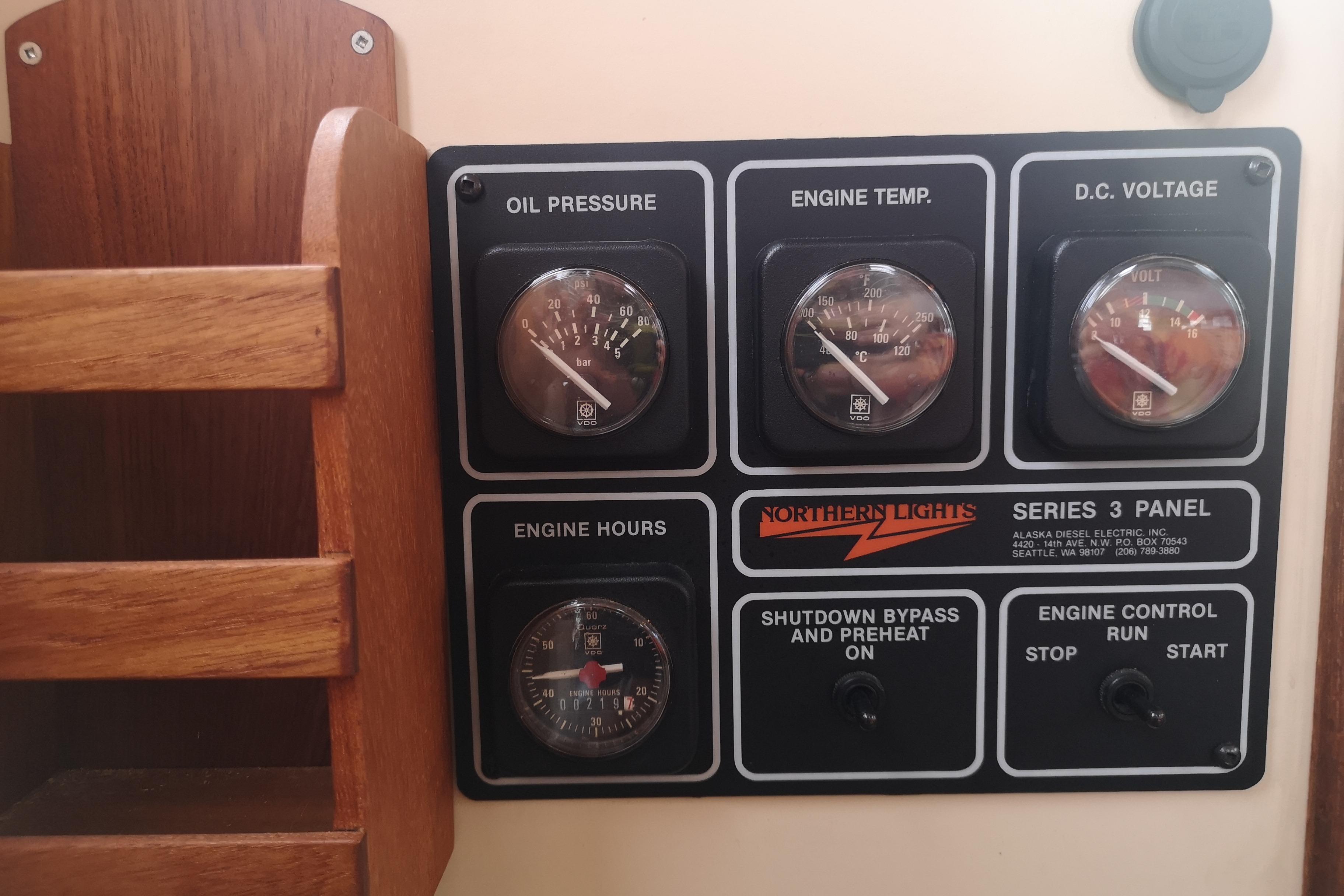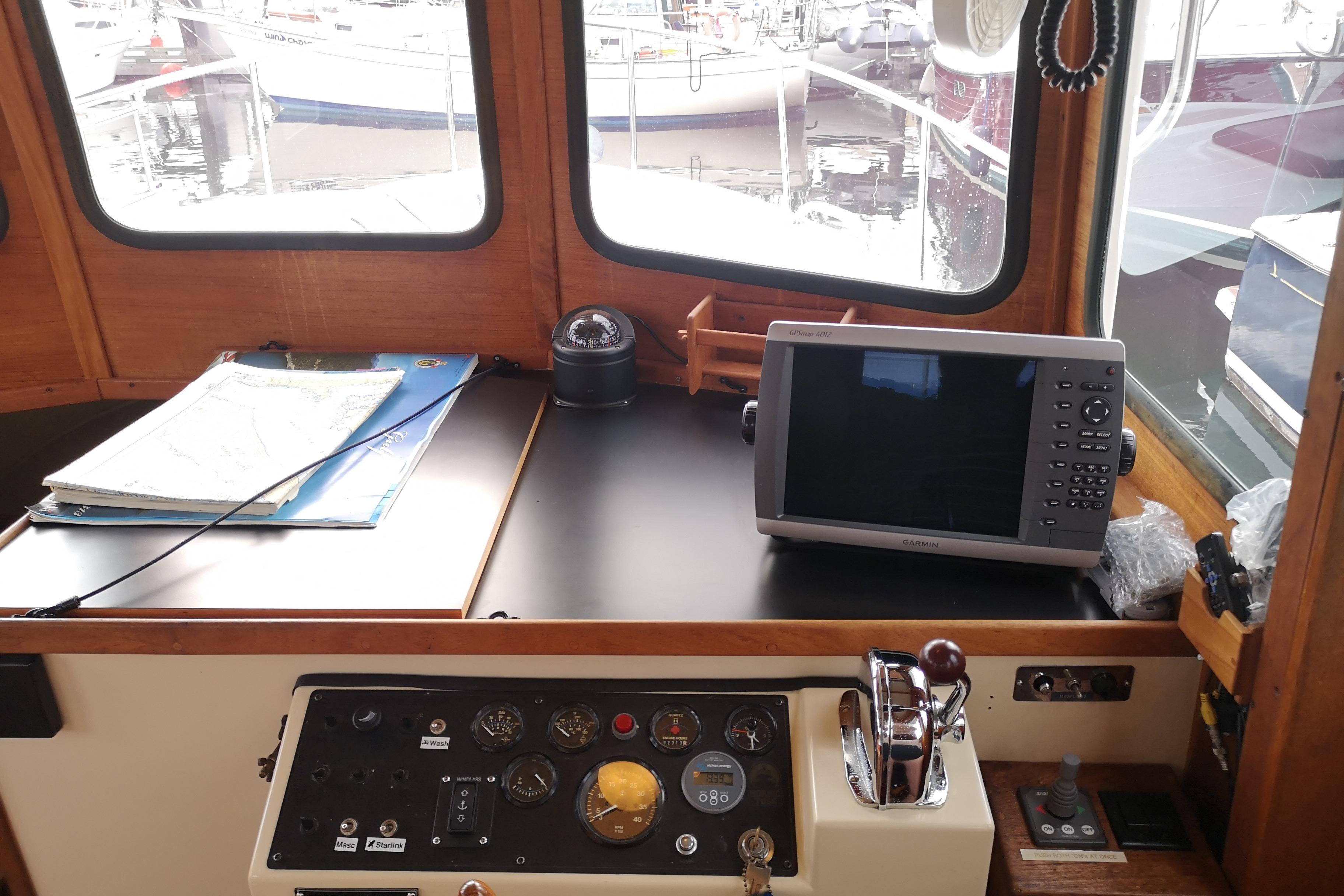 Entering the vessel from the aft the well-designed galley and saloon offers ample natural light, perfect for preparing meals with ease and comfort. Moving to the helm, the full 360-degree windows ensure clear visibility in every direction, enhancing both the control and comfort of navigating the vessel. Modern upgrades such as Garmin plotters have been thoughtfully added, bringing this true classic into the modern age with high-quality navigation displays that enhance both form and function. A bow thruster provides added confidence when maneuvering in tight slips or busy marinas, making docking and close-quarters handling stress-free. Easy access to the bilge and electronics allows for simple maintenance and monitoring.
