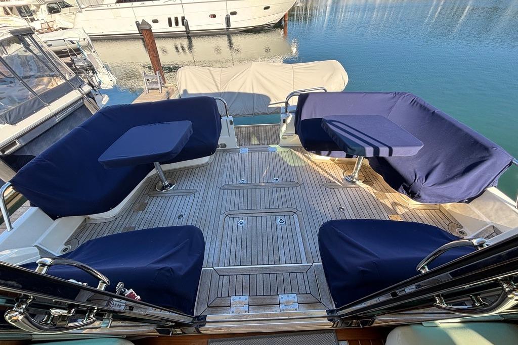 Board easily from the dock, or the tender, to the broad teak-clad swim platform, made clear and usable by stowing the tender on a Freedom Lift. To the cockpit through the large transom door. Then well-positioned handrails lead to the secure side decks port and starboard.