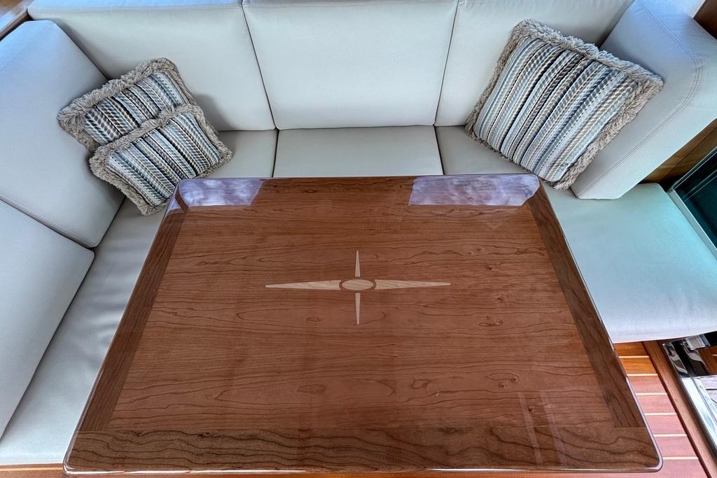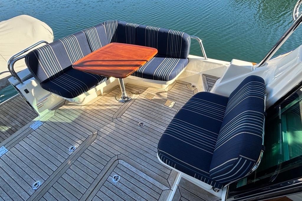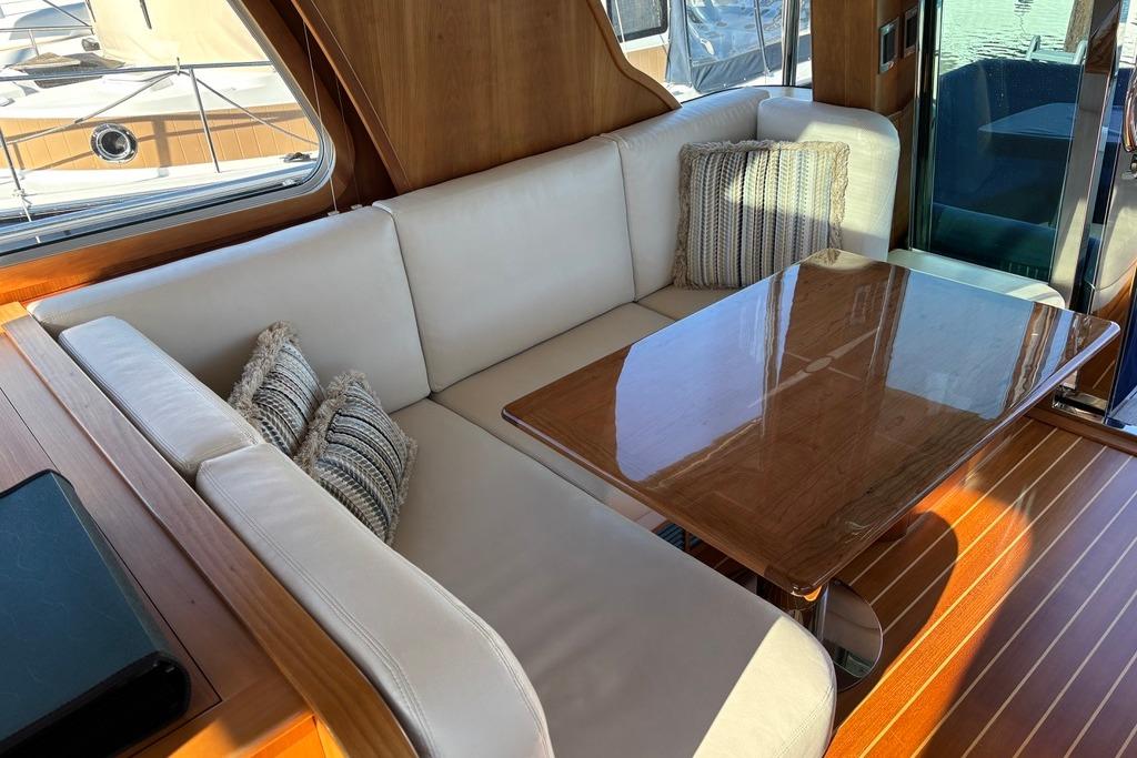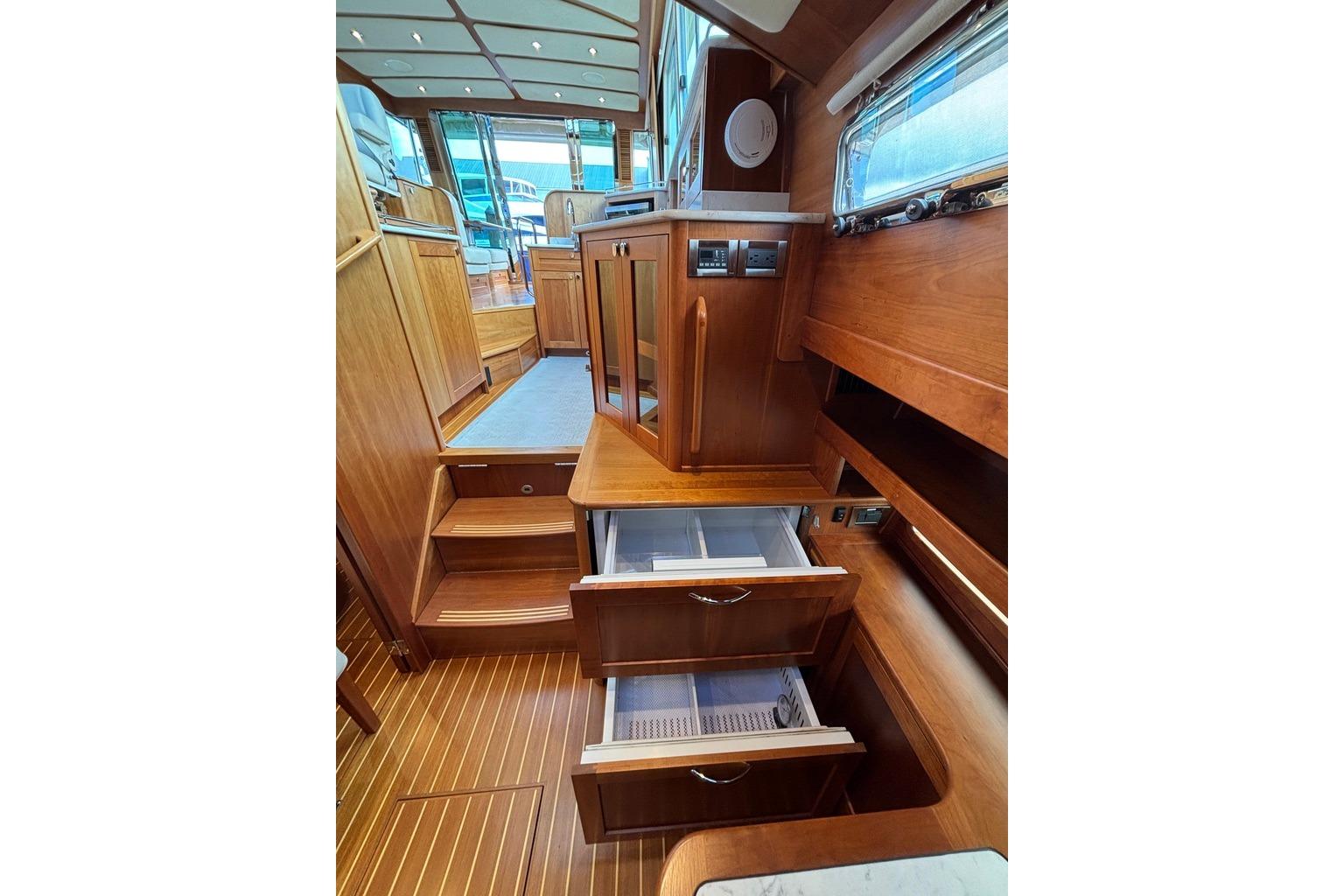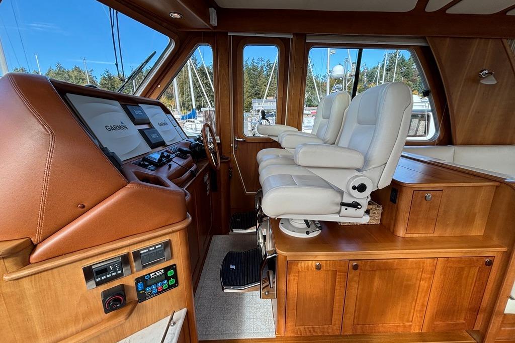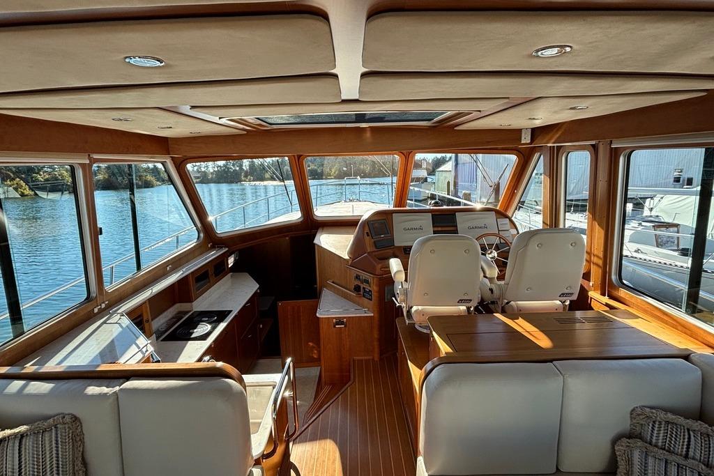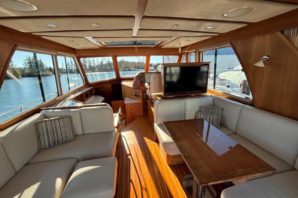 Enter the bright salon with plush settees-ample and comfortable for a small crowd. Helm located forward and to starboard with Stidd seats, all controls, and a door to the side decks.