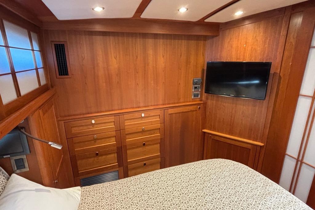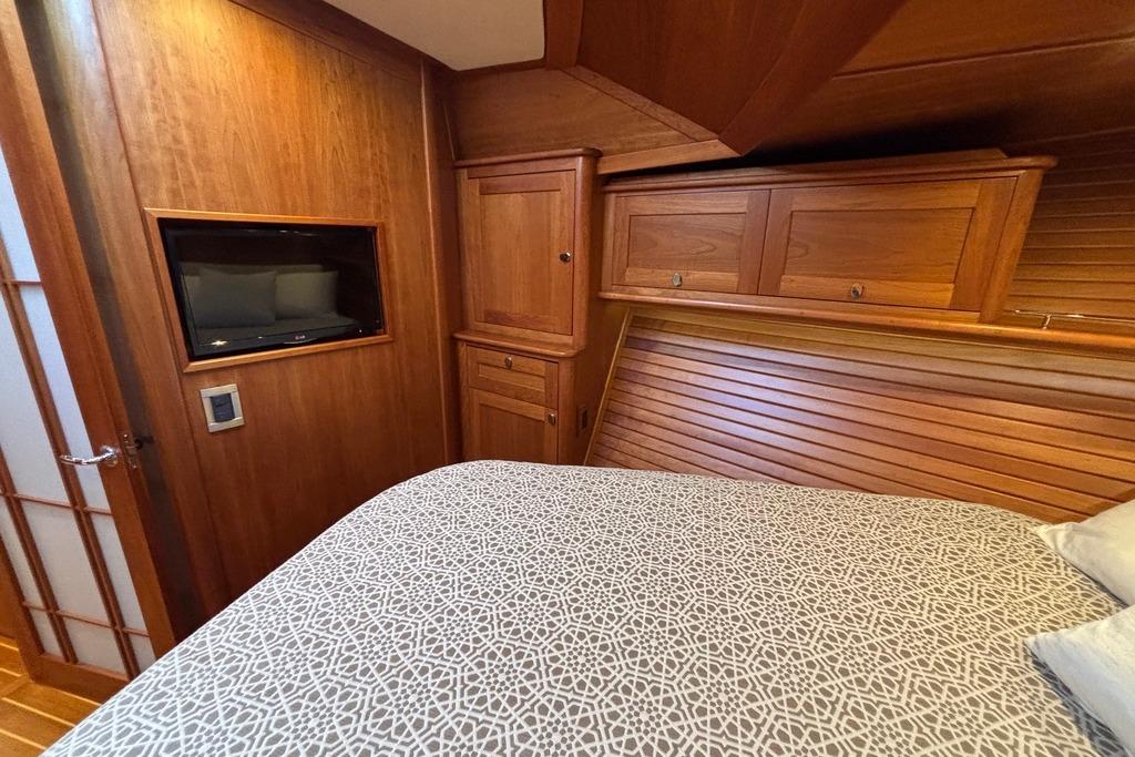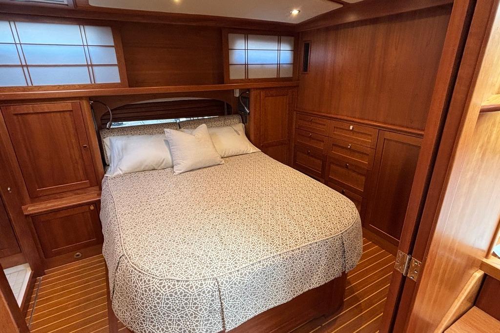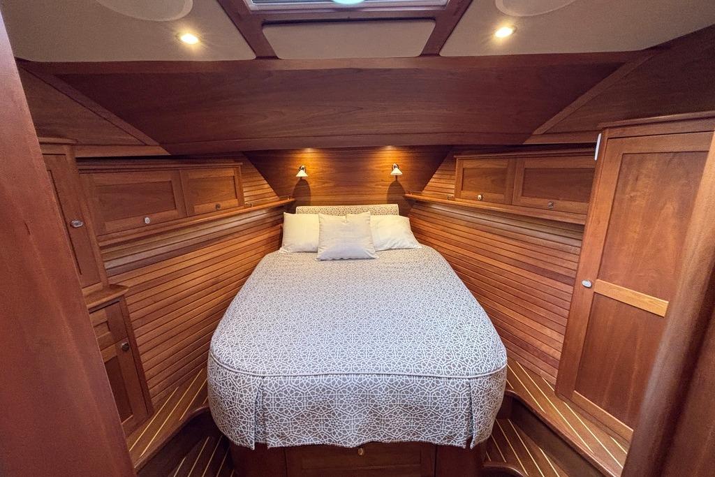 The master stateroom with private ensuite bathroom and shower is to starboard, and to port is the guest day head. Then forward is the private bunk cabin, and further forward is the VIP guest stateroom, with private head and shower