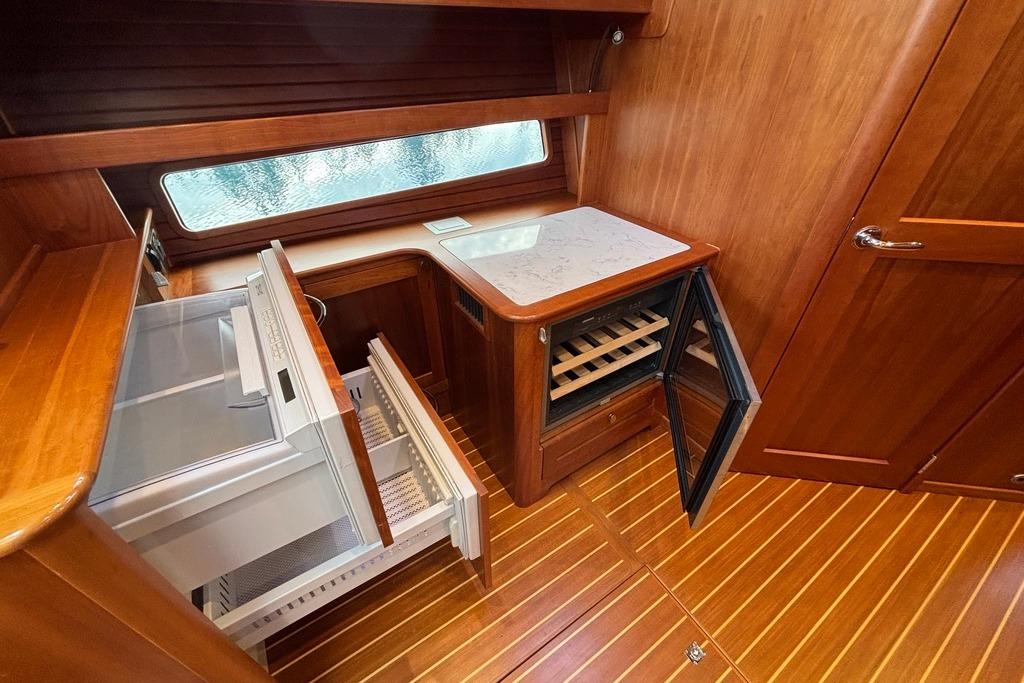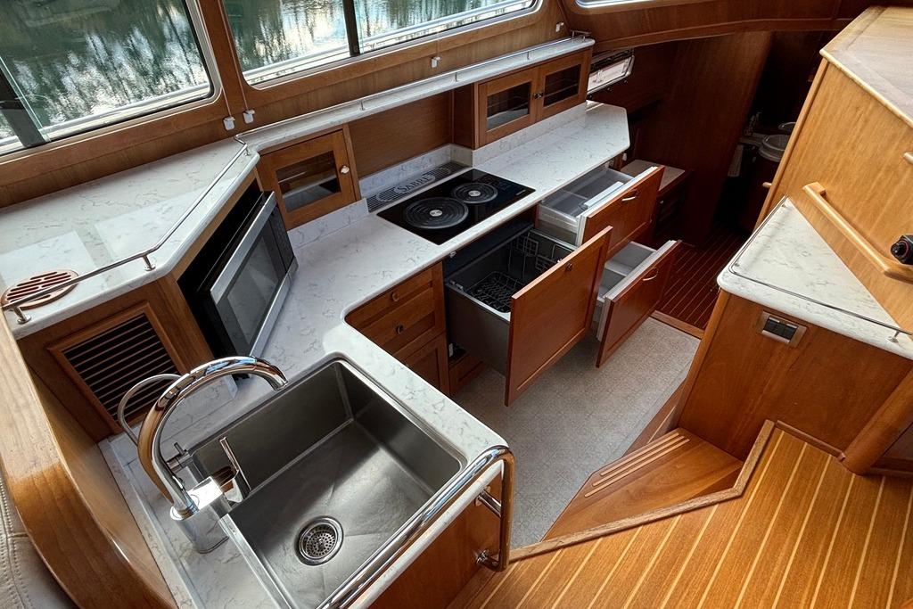 Down a couple of steps from the salon to the linear galley along the port side, with excellent storage and work space Further forward, down a couple more steps, the galley continues, then further forward to the accommodations area and the three cabin / three head layout.
